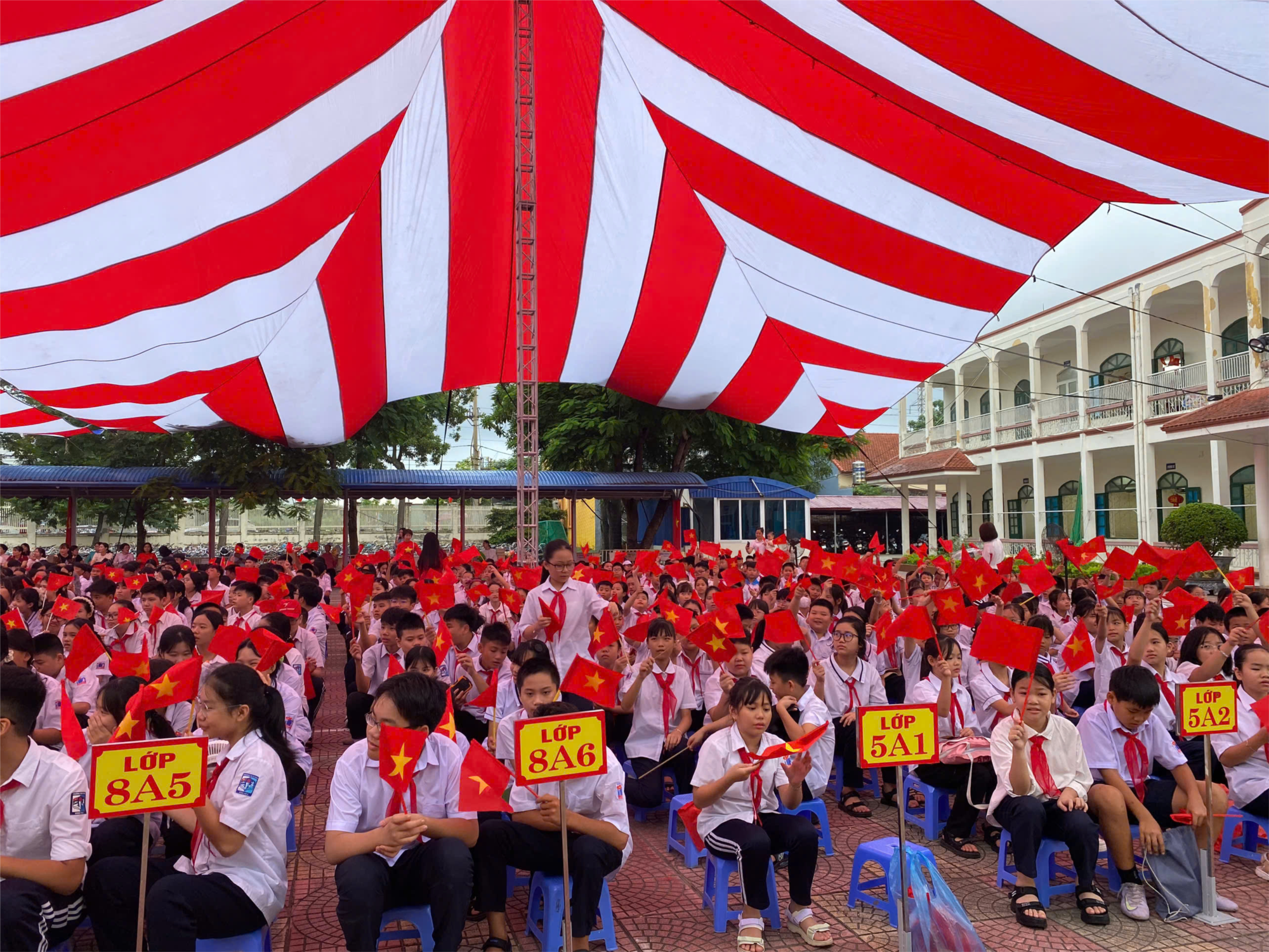 🔸 Sau các tiết mục văn nghệ chào mừng sôi nổi, buổi lễ được diễn ra trang trọng với nghi thức Chào cờ và đặc biệt là phần xem trực tiếp chương trình khai giảng toàn quốc do Bộ Giáo dục & Đào tạo tổ chức trên VTV1. Tiếp đó, thầy Nguyễn Phú Thuấn – Hiệu trưởng nhà trường đã đọc diễn văn khai giảng, khẳng định quyết tâm của thầy và trò trong năm học mới.Nhà trường cũng vinh dự đón nhận những lẵng hoa chúc mừng của Quận uỷ - HĐND - UBND - UBMTTQ Việt Nam quận Hải An, các ban ngành đoàn thể, các đơn vị kết nghĩa,…