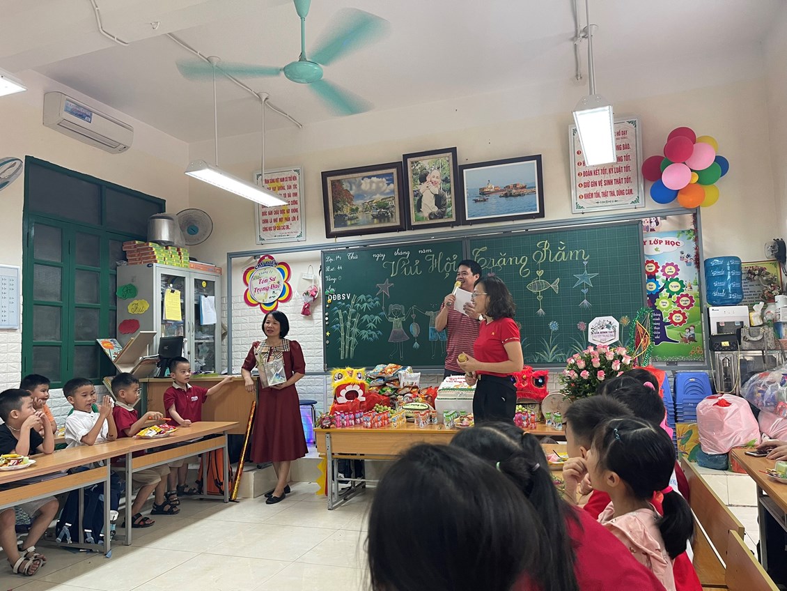 Để tết trung thu thực sự là ngày hội của các em, nhà trường đã tổ chức cho các lớp tham gia làm các mâm cỗ trung thu. Với sự giúp đỡ của các thầy cô giáo và các phụ huynh học sinh, các em học sinh đã được tham gia và thưởng thức các trò chơi “Tìm hiểu về tết trung thu”, được xem múa lân,tham gia cùng với các chú hài xếp bóng.