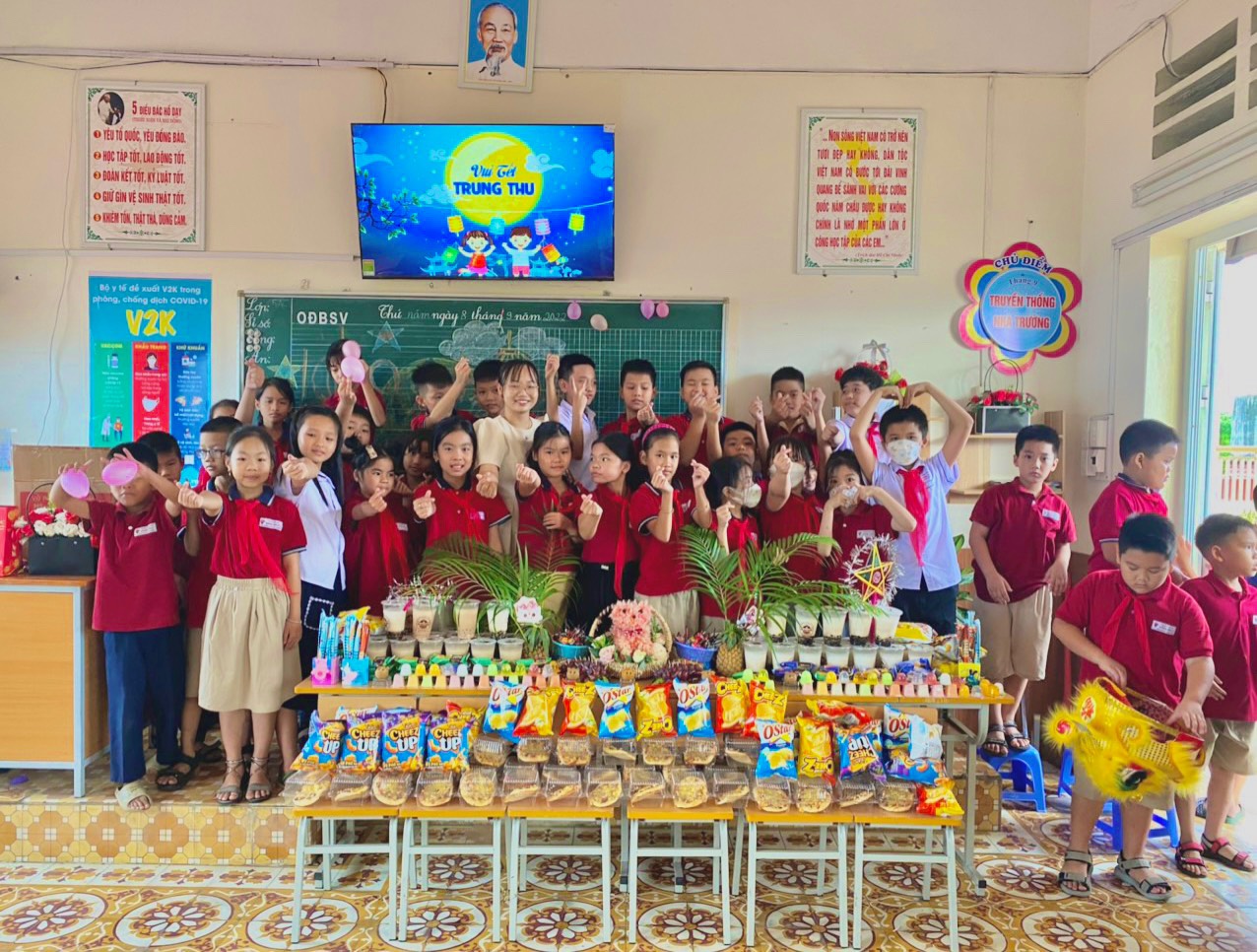 Vui tết trung thu của trường Tiểu học Đông Hải 2 với sự tham gia của cô, trò và hội phụ huynh ở các khối lớp được thể hiện tài khéo léo của mình qua phần sắp xếp mâm cỗ trung thu bằng hoa quả.