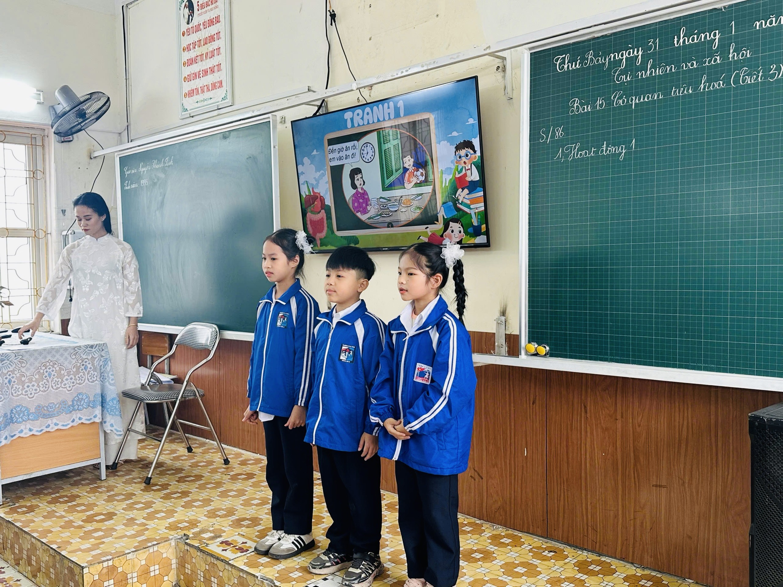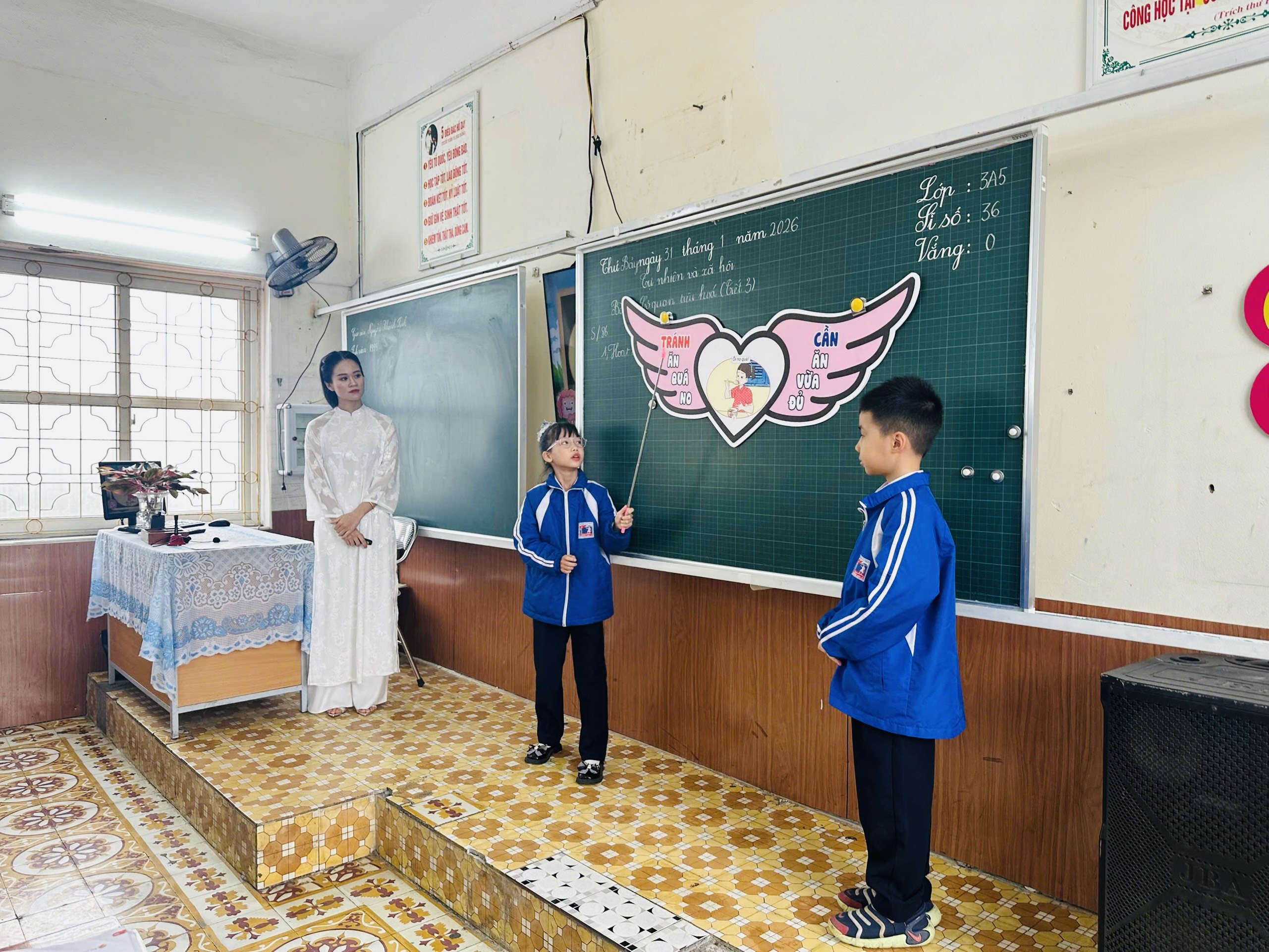 Tại chuyên đề, cô giáo Nguyễn Khánh Linh lên lớp tiết dạy minh họa môn Tự nhiên xã hội lớp 3, bài 15: Cơ quan tiêu hóa (tiết 3). Tiết học được thiết kế theo hướng tăng cường trải nghiệm, tương tác cá nhân hóa hoạt động học tập của học sinh thông qua khai thác hiệu quả công cụ AI, phần mềm dạy học hiệu quả, góp phần tăng cường năng lực số, phát triển năng lực học sinh giúp học sinh tiếp cận kiến thức một cách trực quan và chủ động.